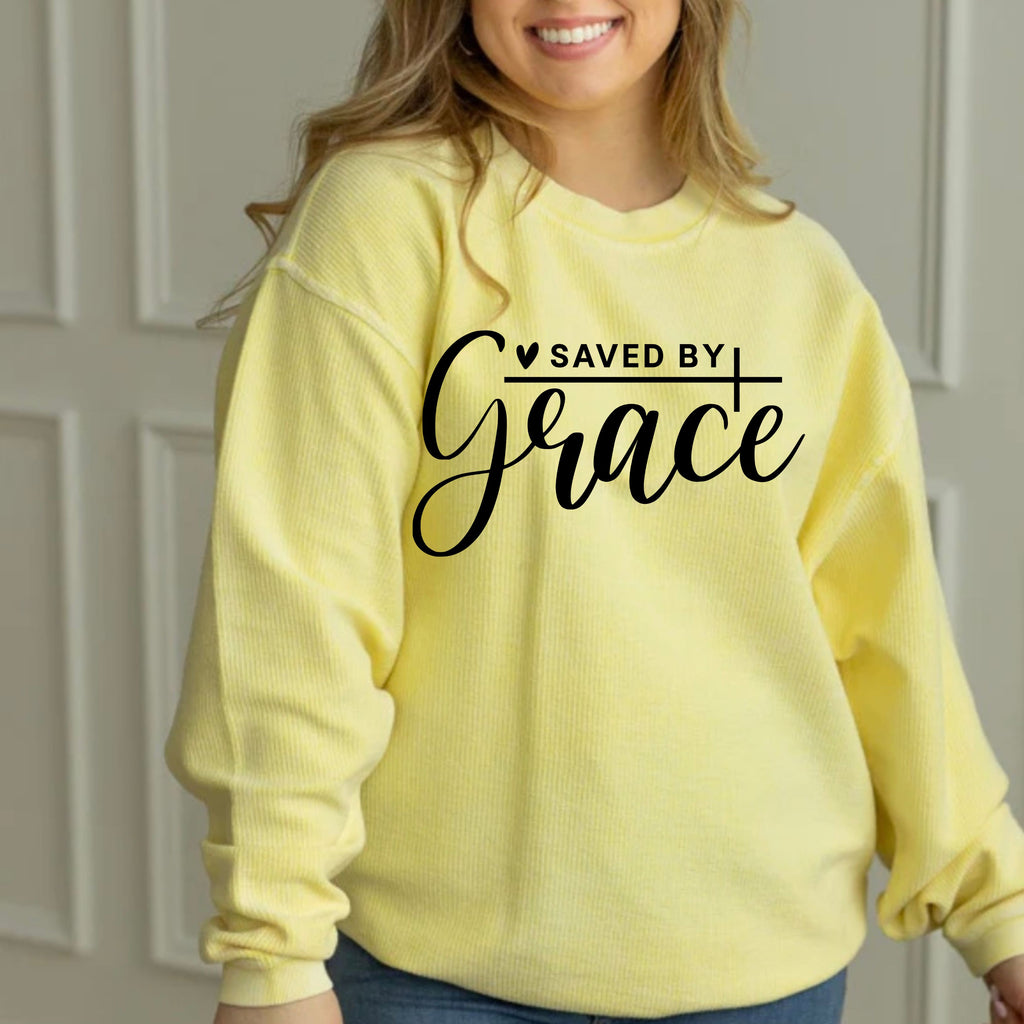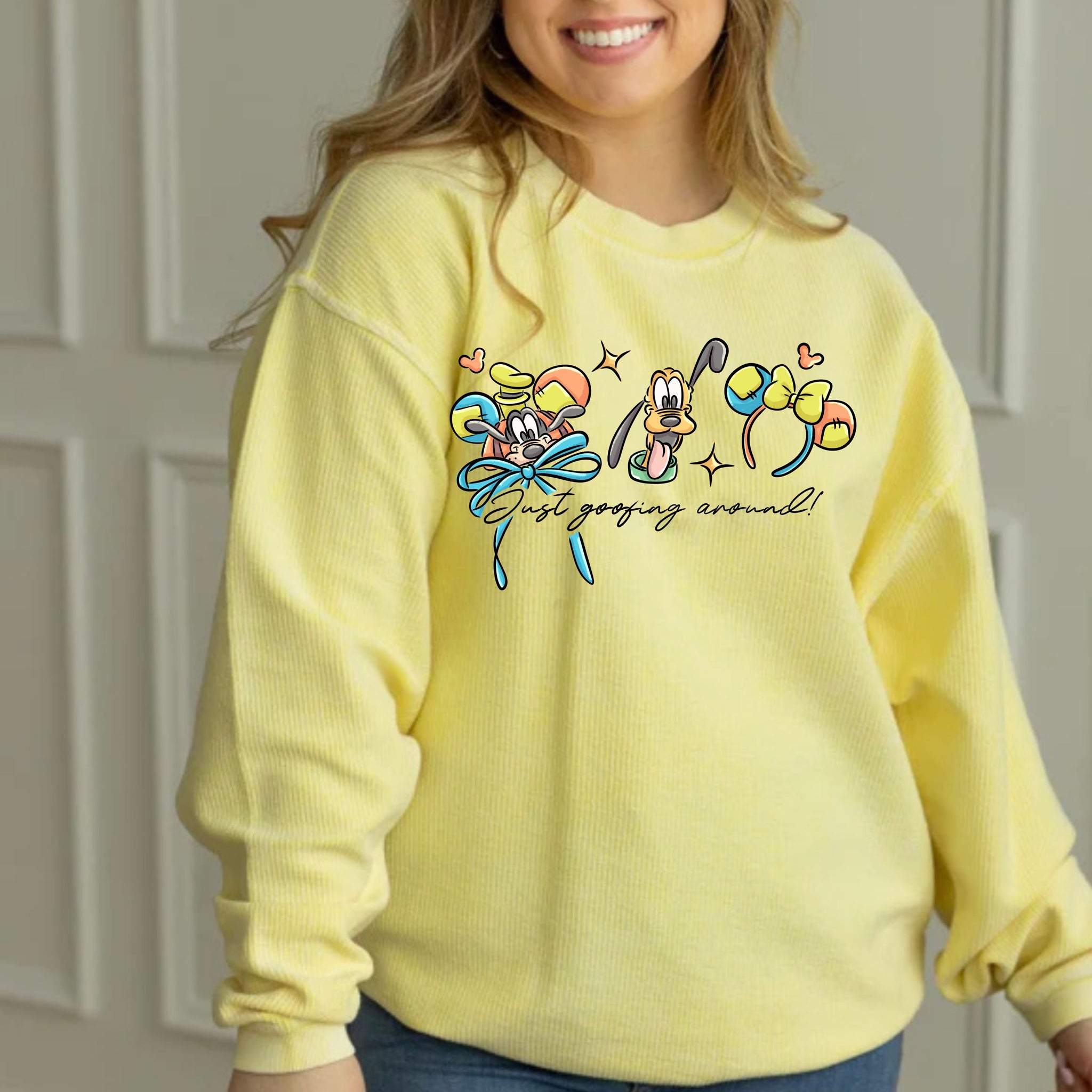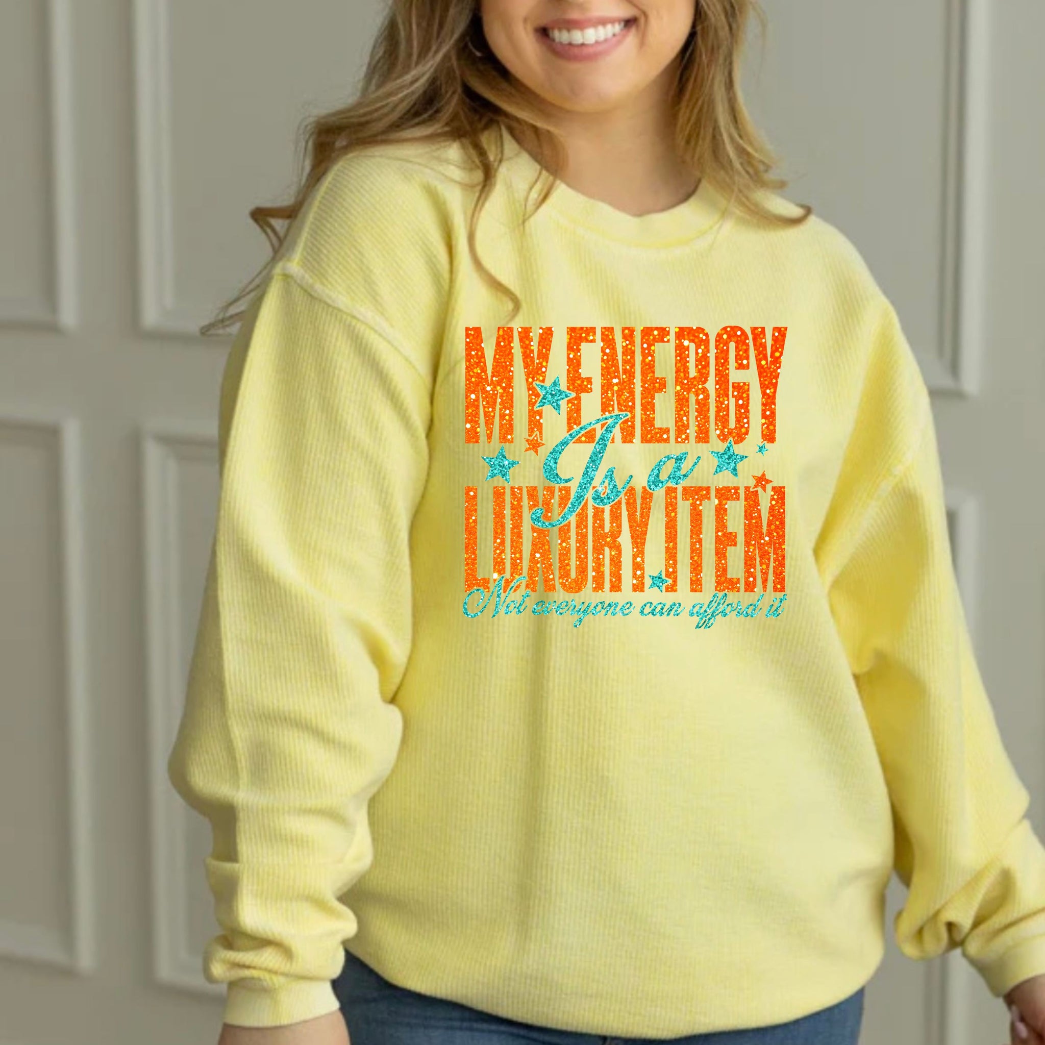 These are an oversized fit 100% cotton long sleeve corded crew in the color banana . You will have a choice between various designs.