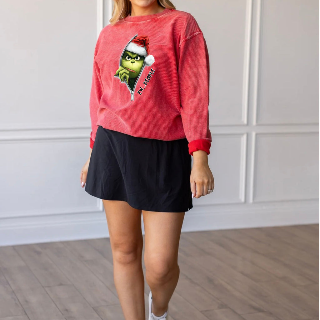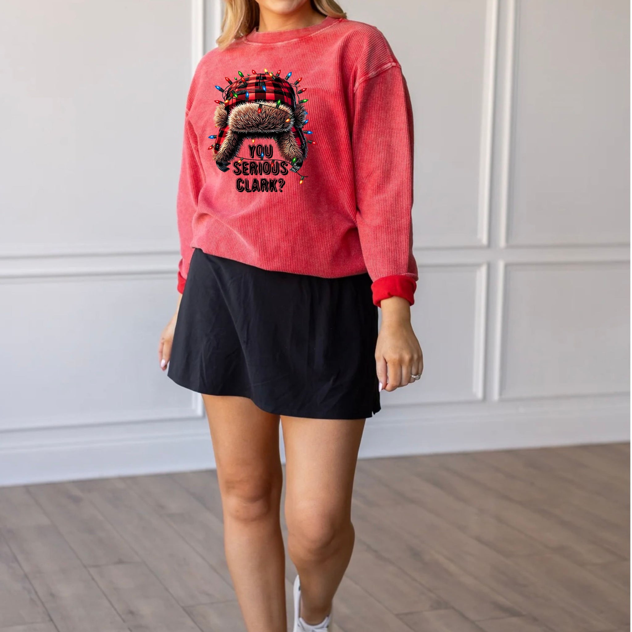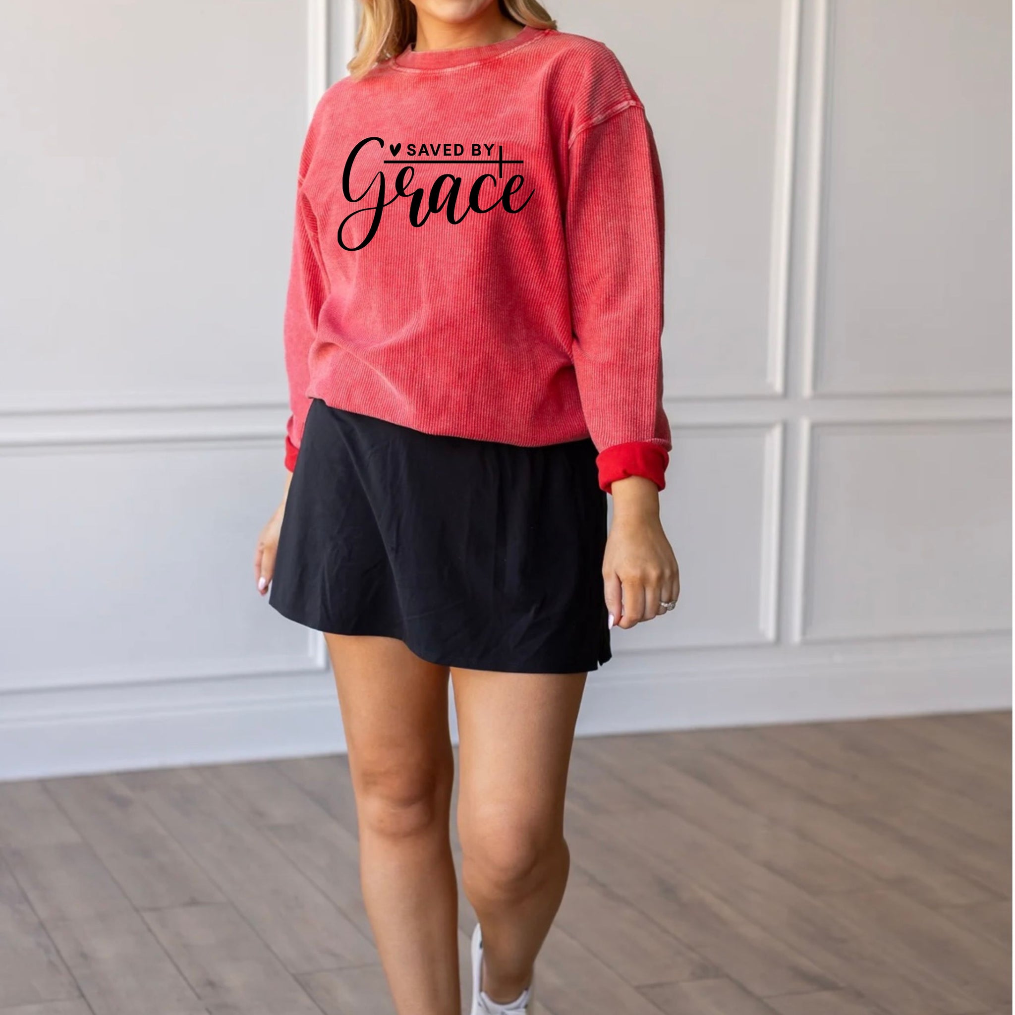 These are an oversized fit 100% cotton long sleeve corded crew in the color eggnog. You will have a choice between various designs.