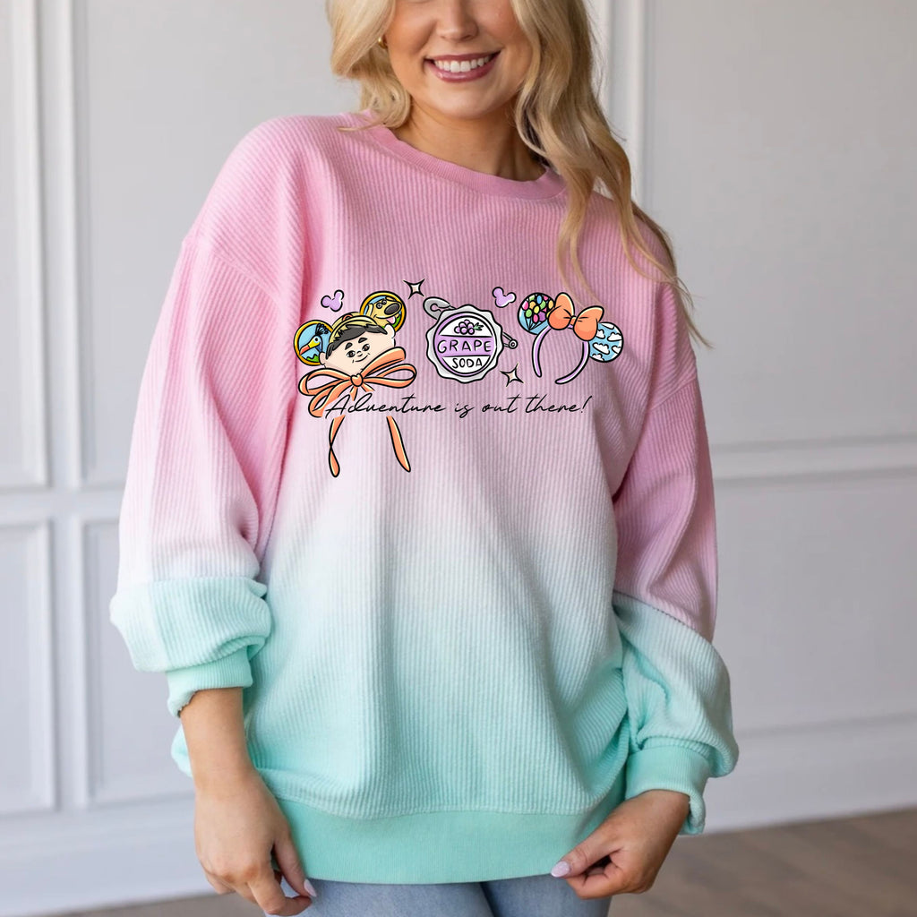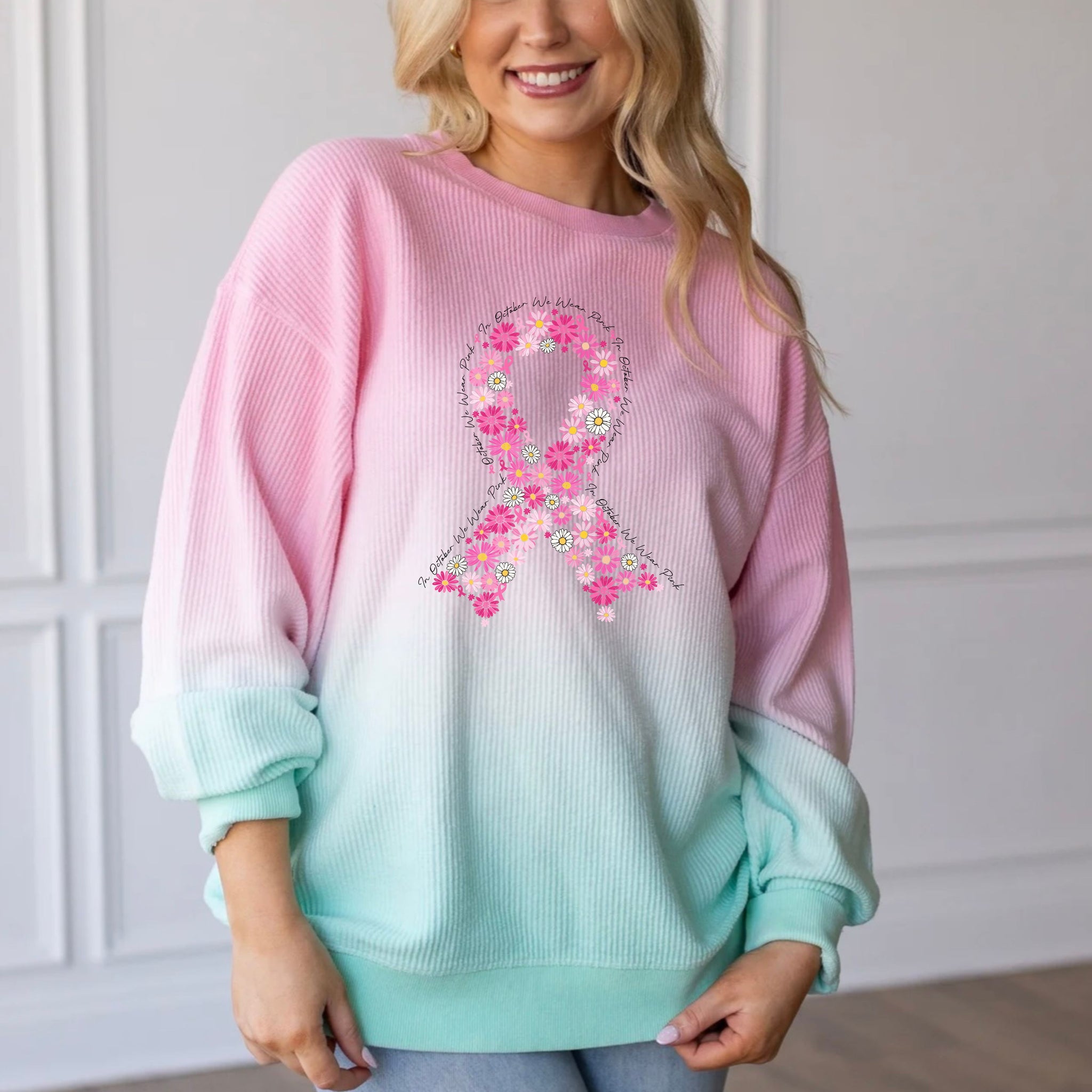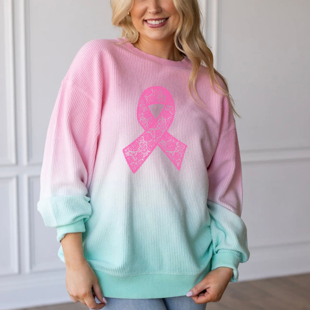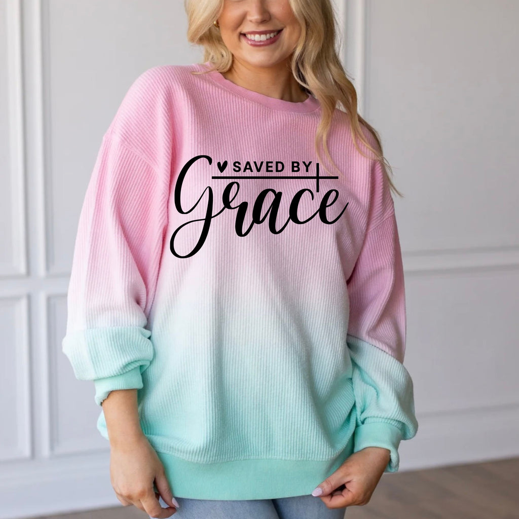 These are an oversized fit 100% cotton long sleeve corded crew in the LIMITED EDITION ombre color. You will have a choice between various designs.