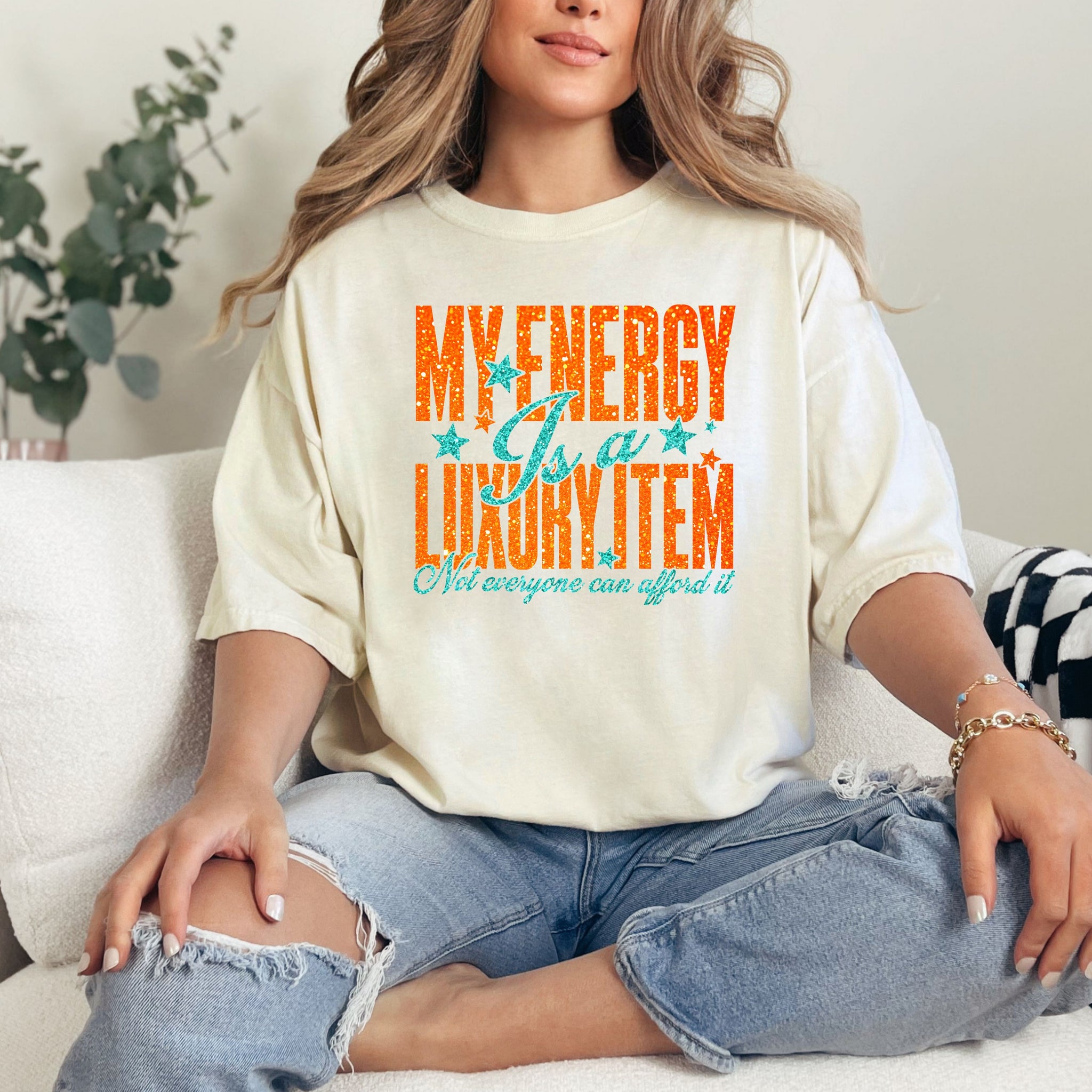 Energy is luxury design. DTF (Direct to film) printed directly on your garment. These are done on Comfort Color T-shirts which are custom dyed 100% ring spun cotton. Sizing on these is true to size. If you want a more oversized fit, size up. If you want a natural fit then get your normal size. (Please see size chart provided).