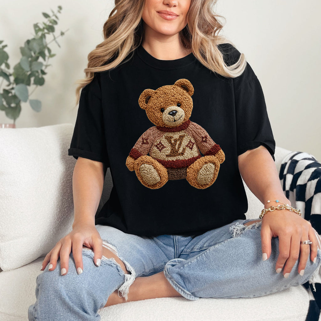 Faux crochet lux bear design. DTF (Direct to film) printed directly on your garment. These are done on Comfort Color T-shirts which are custom dyed 100% ring spun cotton. Sizing on these is true to size. If you want a more oversized fit, size up. If you want a natural fit then get your normal size. (Please see size chart provided).