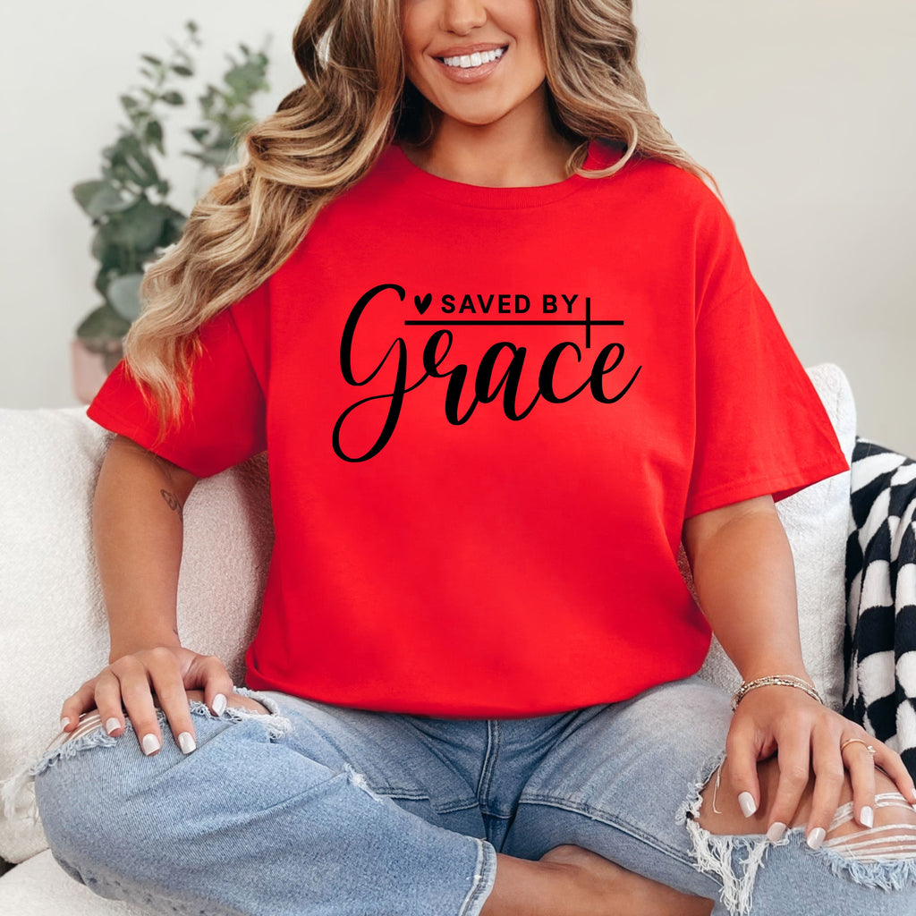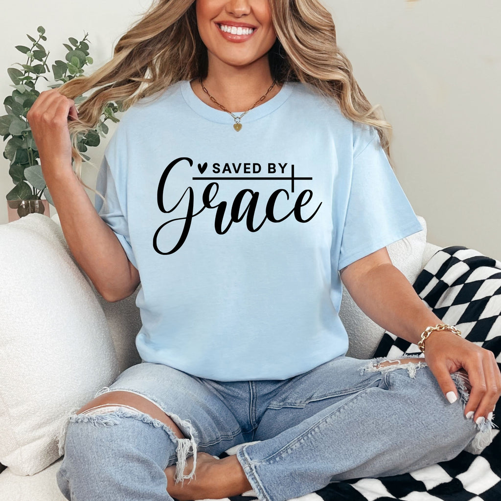 Saved by grace design. DTF (Direct to film) printed directly on your garment. These are done on Comfort Color T-shirts which are custom dyed 100% ring spun cotton. Sizing on these is true to size. If you want a more oversized fit, size up. If you want a natural fit then get your normal size. (Please see size chart provided).