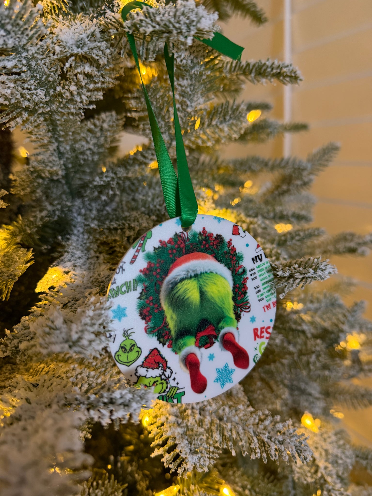 “Mean one” double sided ornaments are done on a white matte 1/8 inch thick acrylic and are UV printed with full color on both the front and back. They are 3.5 inches round and have a beautiful red satin ribbon.