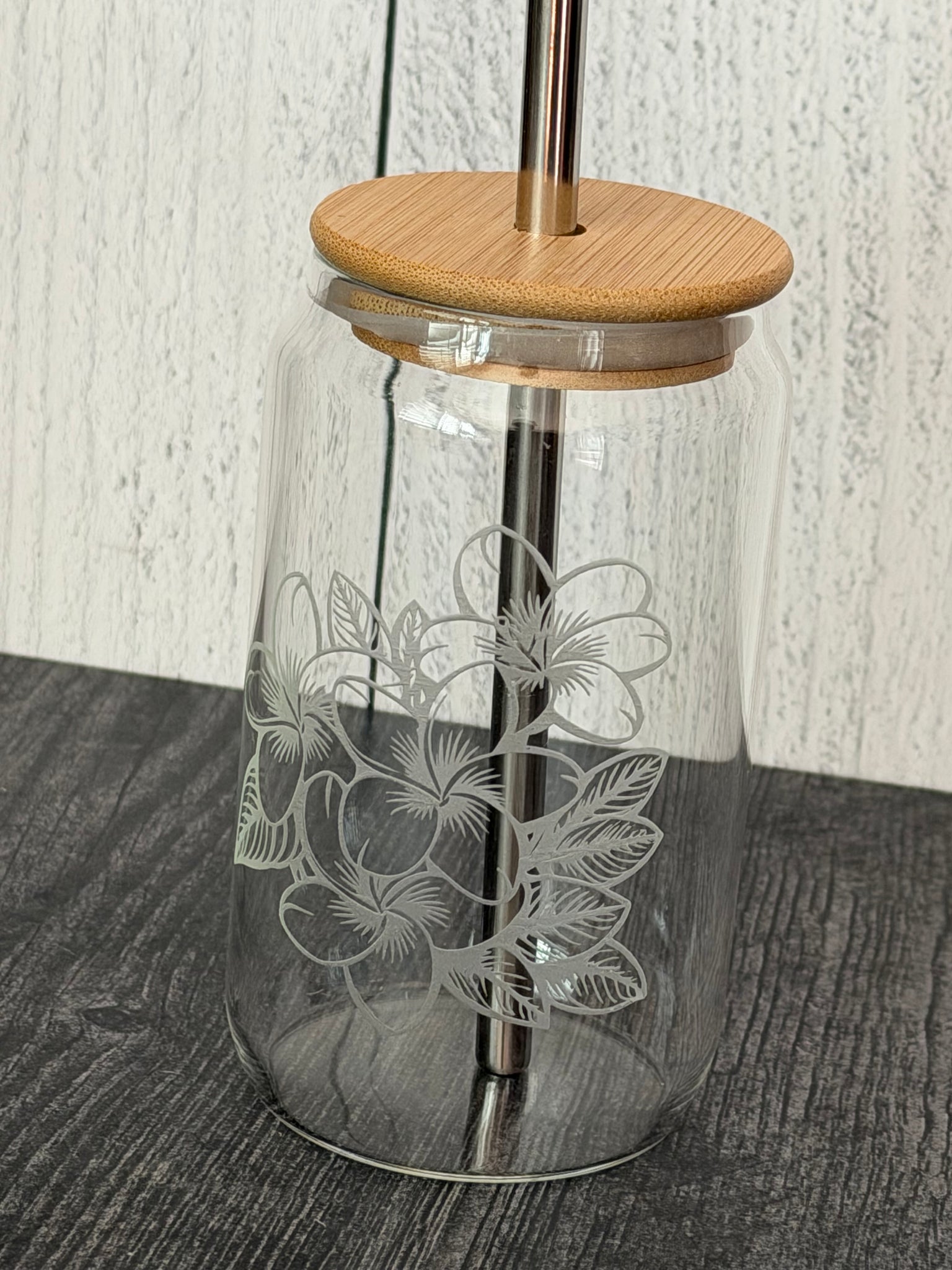 Ready to ship 12 ounce Libby glass sandblaster with the plumeria design