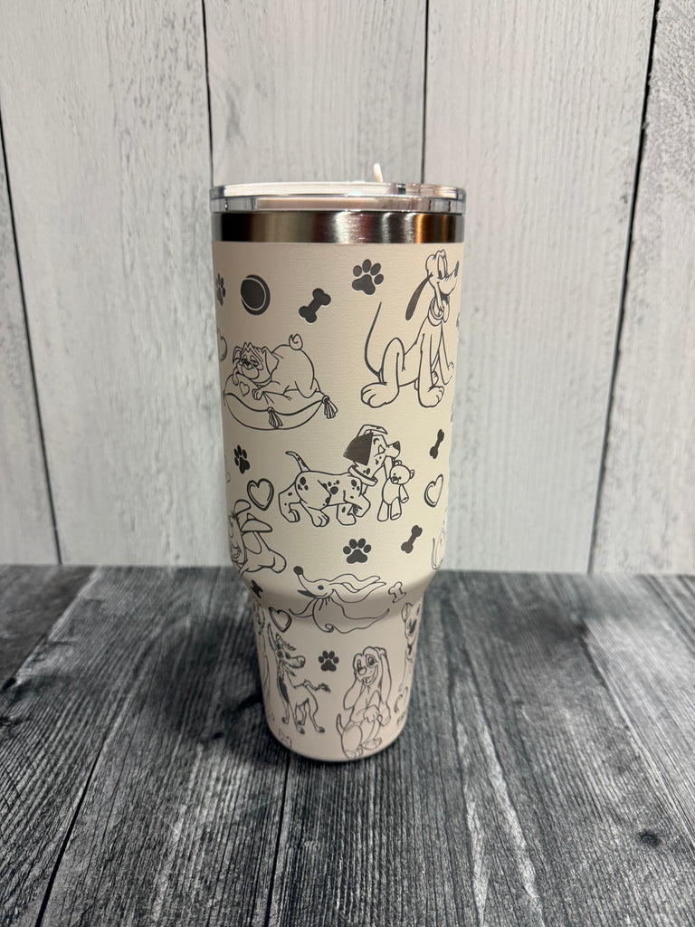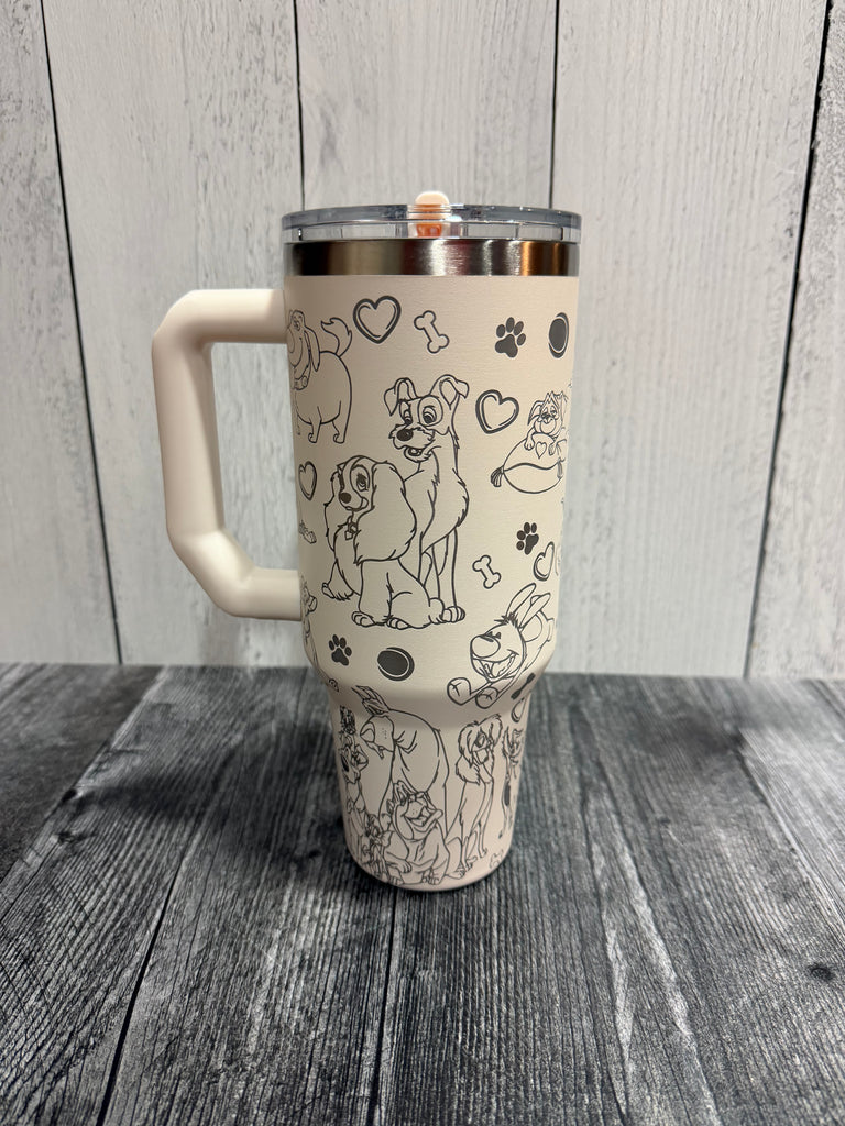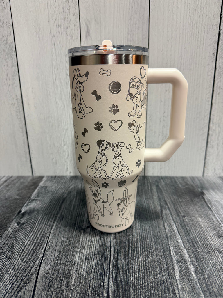 Ready to ship 40 ounce frost buddy thic buddy in the Disney dogs design. It has a new lid design.