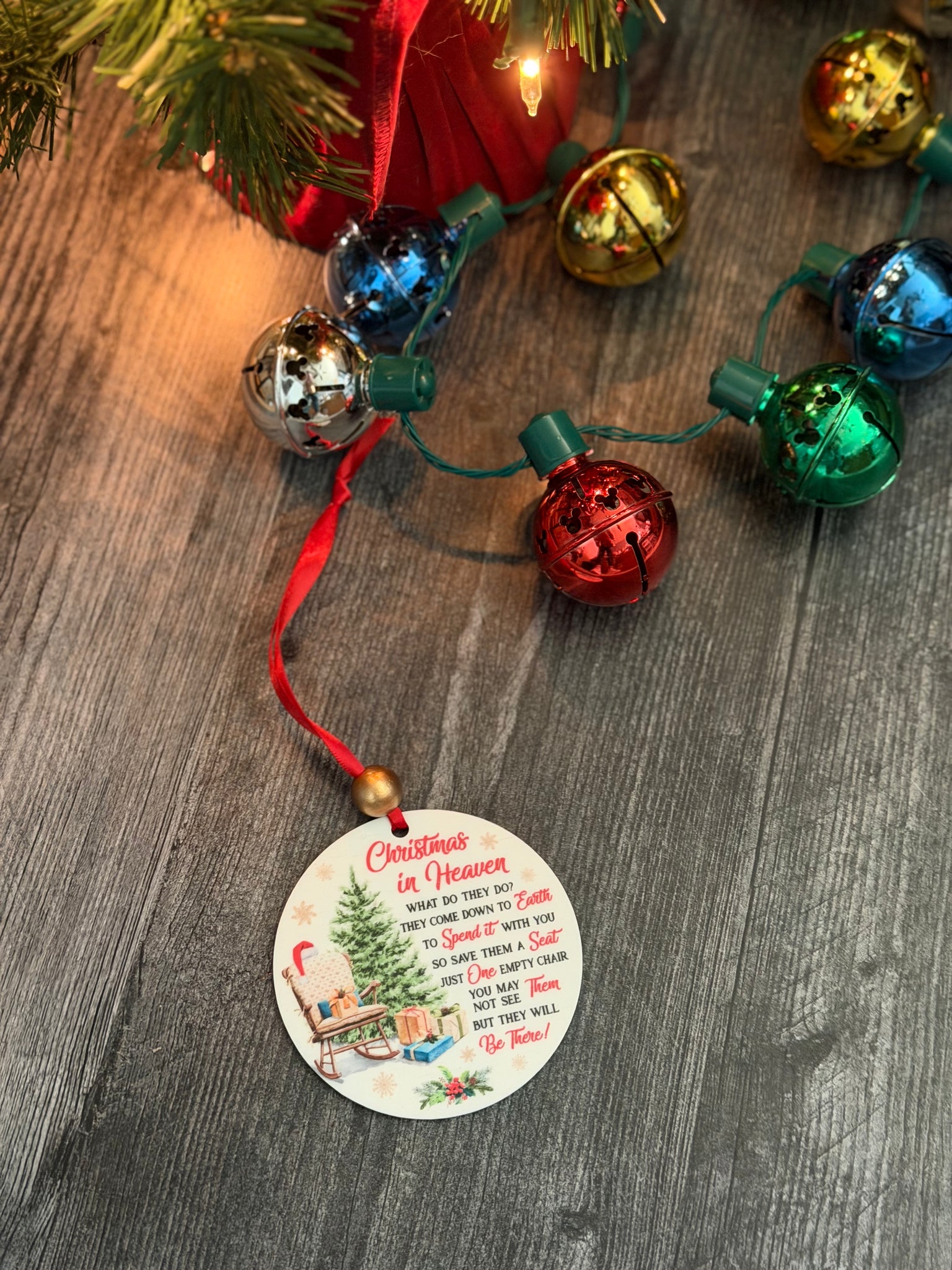 Christmas in Heaven ornaments are done on a white matte 1/8 inch thick acrylic and are UV printed with full color on the front of the ornament. The back of the ornament is blank white. They are 3.5 inches round and have a beautiful red satin ribbon with a gold wooden accent ball.